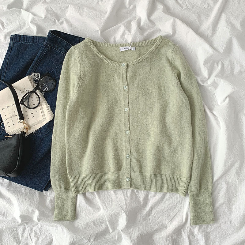 Small pure color sweater new spring women"s fashion lazy style round neck long sleeve single breasted cardigan fashion