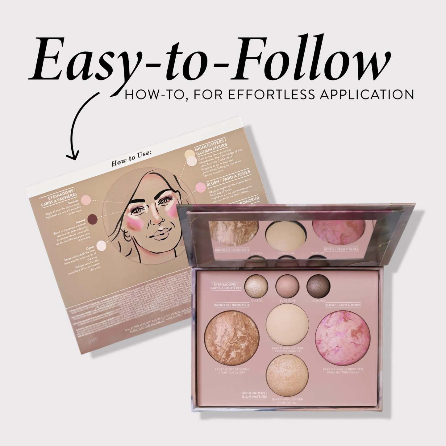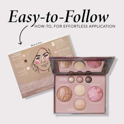 This palette delivers you the perfect essentials to complete your face in one convenient, easy-to-use place. Featuring our bestselling full-sized baked products, including three baked eyeshadows in Oyster, Sunstone, and Almond, Baked Highlighter in French Vanilla and Portofino, Baked Blush-n-Brighten in Pink Buttercream and Baked Body Frosting Bronzer in Tahitian Glow – all universal shades that work for any skin tone! These versatile, highly pigmented products sculpt, define, and highlight your features for flawless, all-day wear. Just start with your favorite foundation, add your favorite mascara and you’re ready to go!
