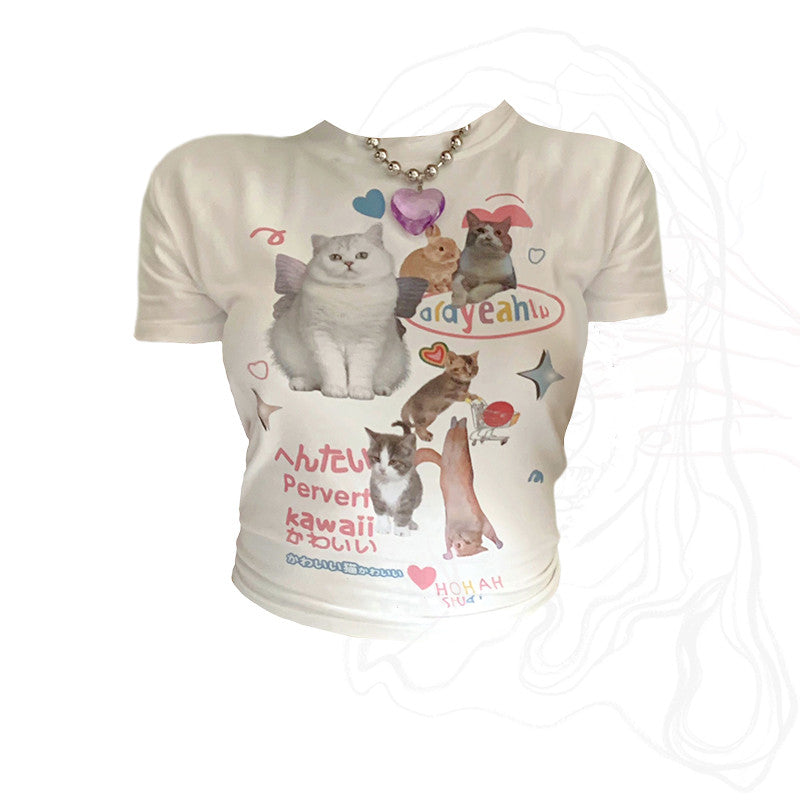 Retro Cat Print Short-sleeved T-shirt For Women